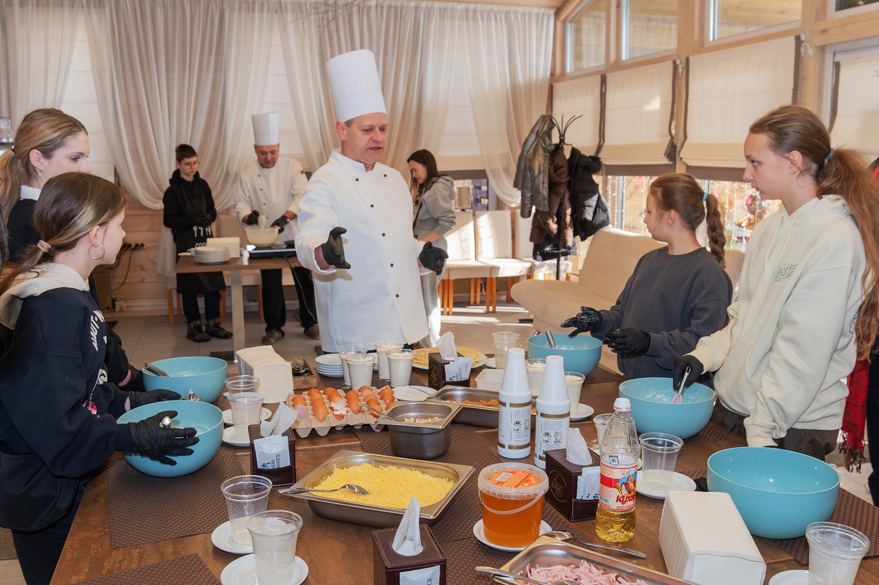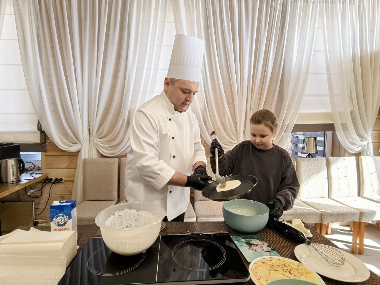 приготовлению блинов. Гости вместе с шеф-поваром замешивали тесто, учились